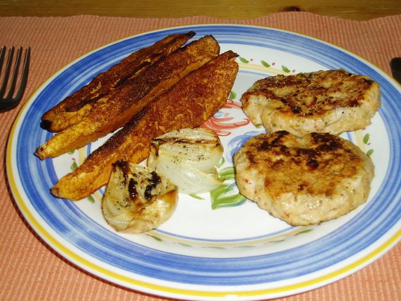 Dagens, kycklingbiffar smaksatta med bla, hickory extrakt, persilja, ajvar å kryddor, sötpotatis klyftor å ugnsbakad lök. MUMS!