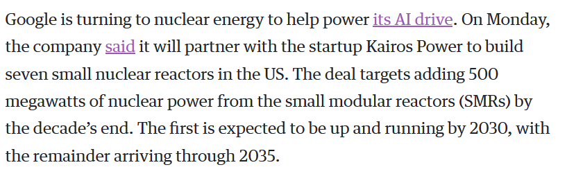 Google har tecknat ett avtal om att bygga 7 kärnreaktorer för att leverera 500 MW kraft till deras AI-datacenter, som tas i drift mellan 2030 och 2035.