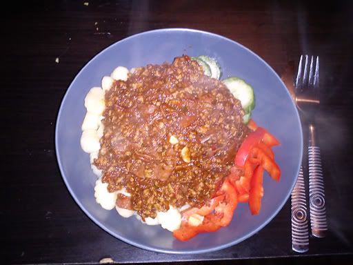 Avslutade i alla fall denna skitdagen med en fin köttfärssås med salami och massa annat gott i. Till det blev det gnocchi, paprika, gurka och lite riven parmesan.