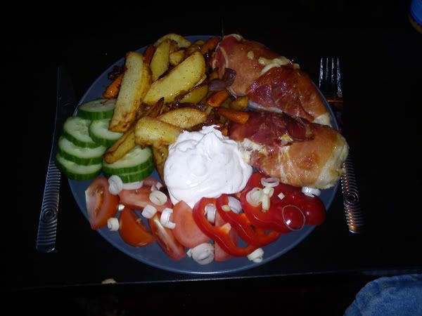 Kycklingfilé lindad i serranoskinka och fylld med cheddarost och soltorkade tomater. Till det serverades en blandning av klyftpotatis, palsternacka, morot, vitlök, rödlök och skivad färsk chili, tillagad i en tefal actifry och grönsaker i form av tomat, paprika, gurka och purjolök. Härlig söndagsmat såhär på måndagskvällen.
