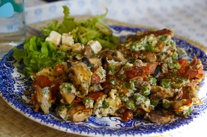 Smått misslyckad omelett (för mycket fyllning + för lite äggstanning p.g.a. äggbrist = omelett som ej går att vända och blir äggröra istället). Men det smakade gott i alla fall.